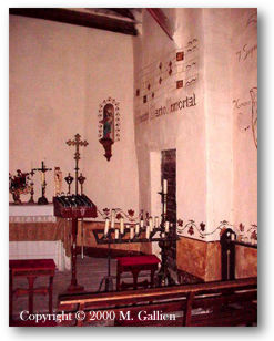 The church not very large inside, but has very high, beamed ceilings. In the photo at left, the door leads to the small building attached to the north side of the building. For a larger view of photo, Click here. Above the altar (right photo) is the window that the assassin in "Vengeance" looked through. For a larger view of photo, Click here.