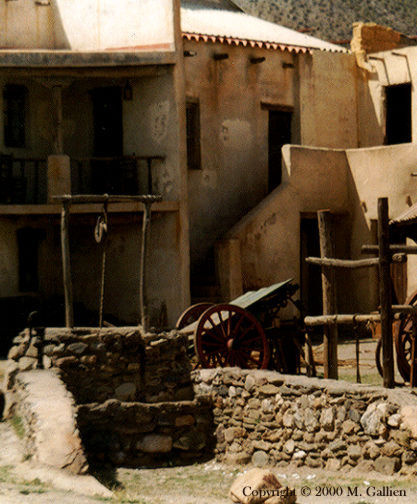 Further north are the soldiers' quarters (left photo) - a two-story building with an intriguing balcony that has been used for some of the show's action. To view the larger image (64K), Click here. A second small building is also included in the soldier's quarters. This covered doorway (right photo) is the site of a scene between Krane and Grisham in "The Hanged Man". To view the larger image (92K), Click here.