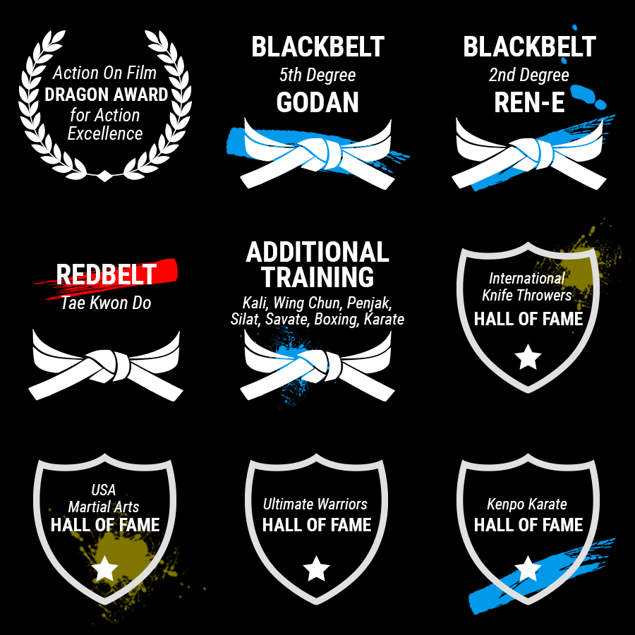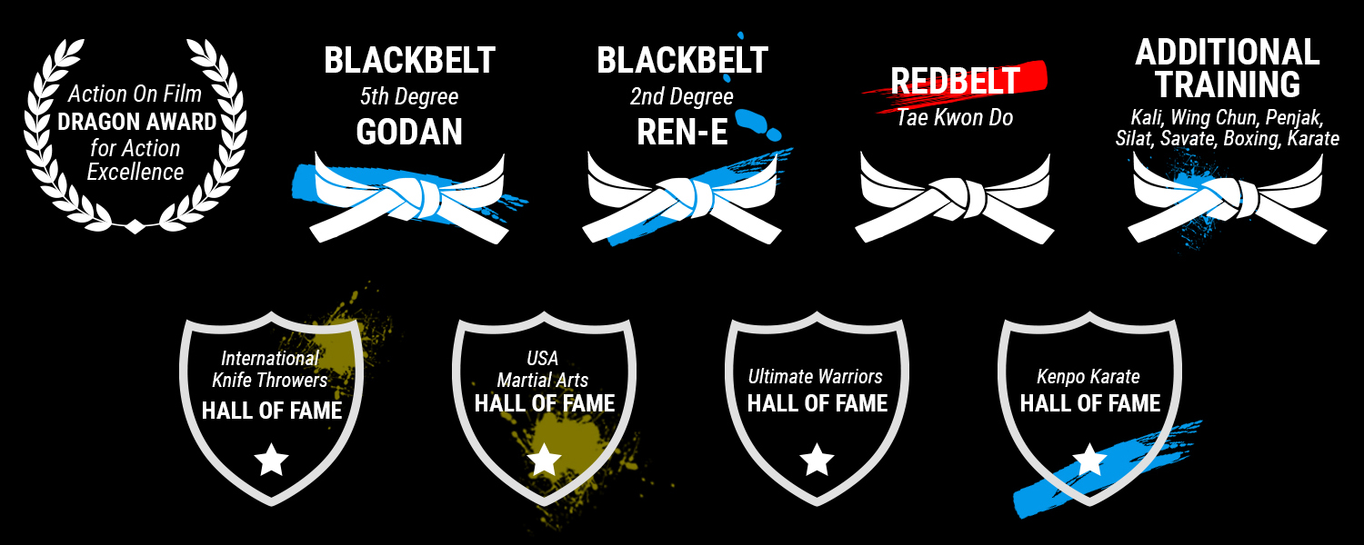 Member of the International Knife Throwers Hall of Fame, US Martial Arts Hall of Fame, Black Belt Hall of Fame, Kenpo Karate Hall of Fame, and Ultimate Warrior's Hall of Fame.